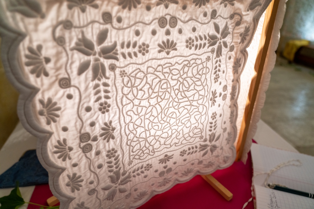 Vendredi, le week-end a démarré avec le vernissage de l’exposition de Marie Sylvestre en partenariat avec l’association Soie et Velours d’Argence, spécialiste du boutis et de l’indiennage (type de tissu), qui a présenté plusieurs de ses créations artisanales dans la Salle des IV Rois.