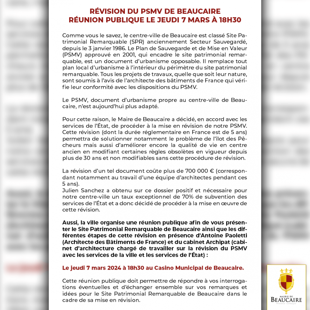 Pour cette raison, le Maire de Beaucaire a décidé, en accord avec les services de l’État, de procéder à la mise en révision de notre PSMV. Cette révision (dont la durée réglementaire en France est de 5 ans) permettra de solutionner notamment le problème de l’îlot des Pêcheurs mais aussi d’améliorer encore la qualité de vie en centre ancien en modifiant certaines règles obsolètes en vigueur depuis plus de 30 ans et non modifiables sans cette procédure de révision.
