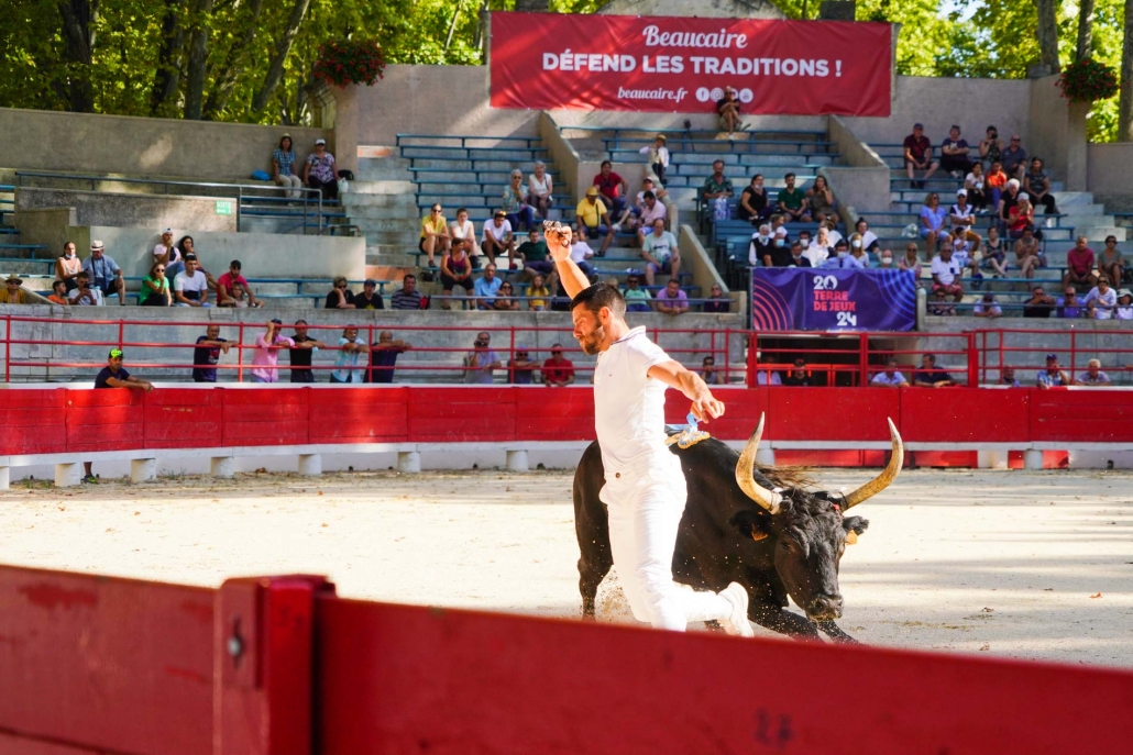 Avant le début de la course, le raseteur Julien Ouffe s’est vu remettre un trophée des mains de M. le Maire, puisqu’il effectuait ce jour sa dernière course dans les Arènes de Beaucaire avant de mettre fin à sa carrière, Arènes dans lesquelles il avait brillamment remporté la Palme d’Or en 2012.